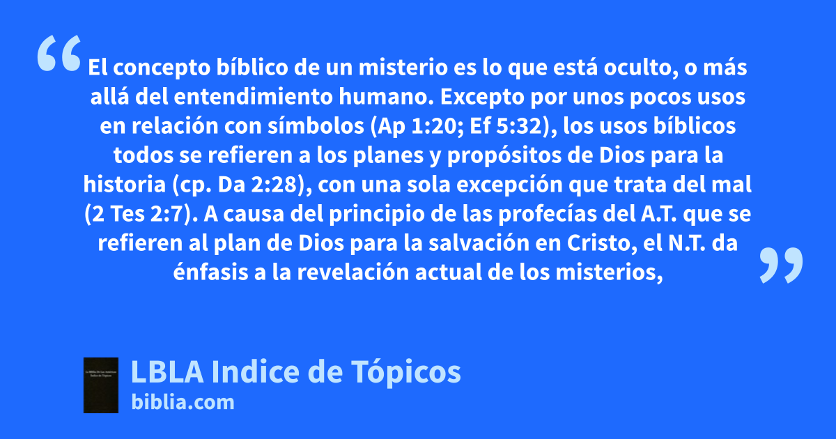 El concepto bíblico de un misterio es lo que está oculto, o más allá del entendimiento humano. Excepto por unos pocos usos en relación con símbolos (Ap 1:20; Ef 5:32), los usos bíblicos todos se refieren a los planes y propósitos de Dios para la historia (cp. Da 2:28), con una sola excepción que trata del mal (2 Tes 2:7). A causa del principio de las profecías del A.T. que se refieren al plan de Dios para la salvación en Cristo, el N.T. da énfasis a la revelación actual de los misterios, incluyendo tanto su interpretación en la enseñanza apostólica como su realización en la experiencia histórica. La revelación de un misterio y su comprensión sólo vienen de Dios (cp. 1 Co 2:6–12).