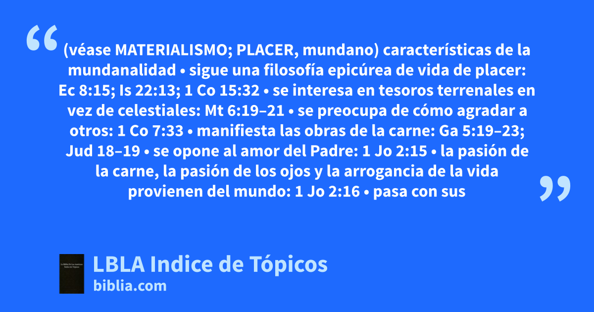 características de la mundanalidad • sigue una filosofía epicúrea de vida de placer: Ec 8:15; Is 22:13; 1 Co 15:32 • se interesa en tesoros terrenales en vez de celestiales: Mt 6:19–21 • se preocupa de cómo agradar a otros: 1 Co 7:33 • manifiesta las obras de la carne: Ga 5:19–23; Jud 18–19 • se opone al amor del Padre: 1 Jo 2:15 • la pasión de la carne, la pasión de los ojos y la arrogancia de la vida provienen del mundo: 1 Jo 2:16 • pasa con sus pasiones: 1 Jo 2:17 (cp. 1 Co 7:31) • referencias generales: Tit 3:3; 2 Pe 2:12–22