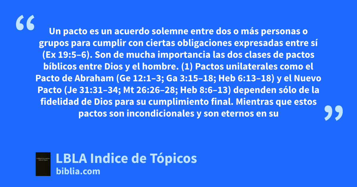 Un pacto es un acuerdo solemne entre dos o más personas o grupos para cumplir con ciertas obligaciones expresadas entre sí (Ex 19:5–6). Son de mucha importancia las dos clases de pactos bíblicos entre Dios y el hombre. (1) Pactos unilaterales como el Pacto de Abraham (Ge 12:1–3; Ga 3:15–18; Heb 6:13–18) y el Nuevo Pacto (Je 31:31–34; Mt 26:26–28; Heb 8:6–13) dependen sólo de la fidelidad de Dios para su cumplimiento final. Mientras que estos pactos son incondicionales y son eternos en su continuación (Sal 105:8–10; Heb 13:20), se requiere fe obediente para experimentar personalmente las bendiciones de estos pactos (Ge 12:1–3; 2 S 7:14–15; 1 R 11:9–13; Jn 3:36; Hch 16:31; Ro 3:22–26; Heb 10:19–22, 26–29; 11:8). (2) Pactos mutuos como el Mosaico o Antiguo Pacto (Ex 19:5–6; Je 31:32; 2 Co 3:6–17; Col 2:14; Ga 3:15–19; 4:21–31; Heb 7:1–10:18) requieren que las dos partes cumplan con ciertas condiciones para la continuación del pacto.