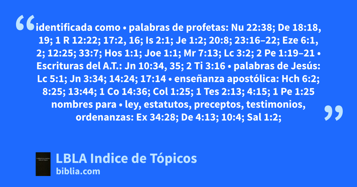 identificada como • palabras de profetas: Nu 22:38; De 18:18, 19; 1 R 12:22; 17:2, 16; Is 2:1; Je 1:2; 20:8; 23:16–22; Eze 6:1, 2; 12:25; 33:7; Hos 1:1; Joe 1:1; Mr 7:13; Lc 3:2; 2 Pe 1:19–21 • Escrituras del A.T.: Jn 10:34, 35; 2 Ti 3:16 • palabras de Jesús: Lc 5:1; Jn 3:34; 14:24; 17:14 • enseñanza apostólica: Hch 6:2; 8:25; 13:44; 1 Co 14:36; Col 1:25; 1 Tes 2:13; 4:15; 1 Pe 1:25