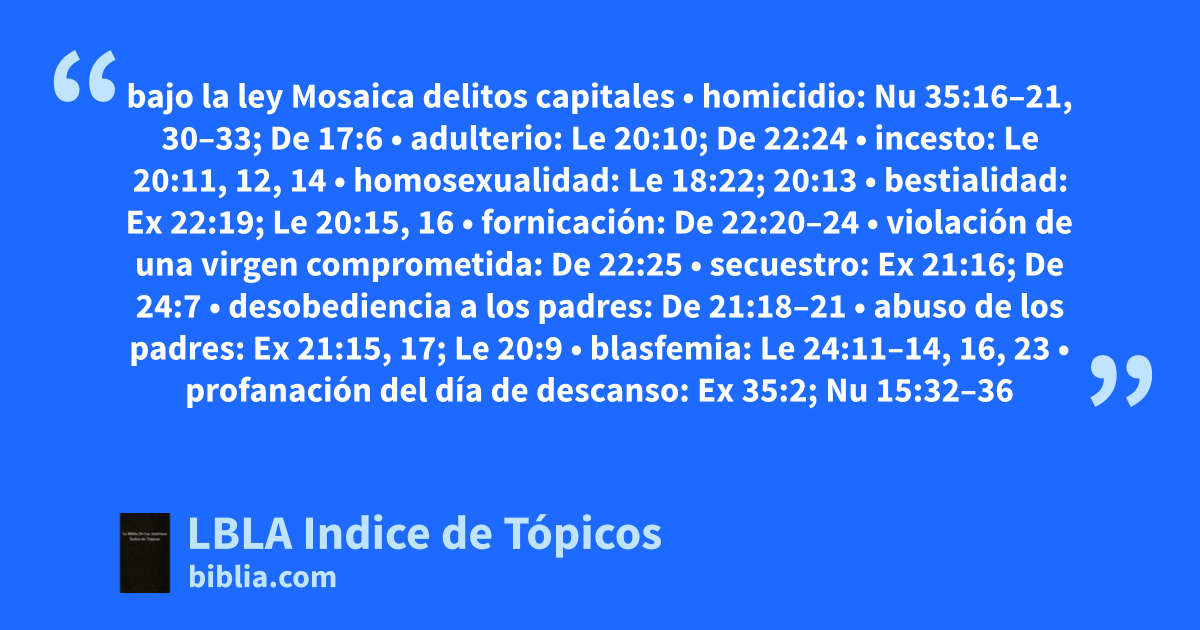 delitos capitales • homicidio: Nu 35:16–21, 30–33; De 17:6 • adulterio: Le 20:10; De 22:24 • incesto: Le 20:11, 12, 14 • homosexualidad: Le 18:22; 20:13 • bestialidad: Ex 22:19; Le 20:15, 16 • fornicación: De 22:20–24 • violación de una virgen comprometida: De 22:25 • secuestro: Ex 21:16; De 24:7 • desobediencia a los padres: De 21:18–21 • abuso de los padres: Ex 21:15, 17; Le 20:9 • blasfemia: Le 24:11–14, 16, 23 • profanación del día de descanso: Ex 35:2; Nu 15:32–36 • hechicería: Ex 22:18 • sacrificios humanos: Le 20:2–5 • profecía o enseñanza falsa: De 13:1–10 • sacrificio a dioses falsos: Ex 22:20 • por no acatar la decisión de una corte: De 17:12