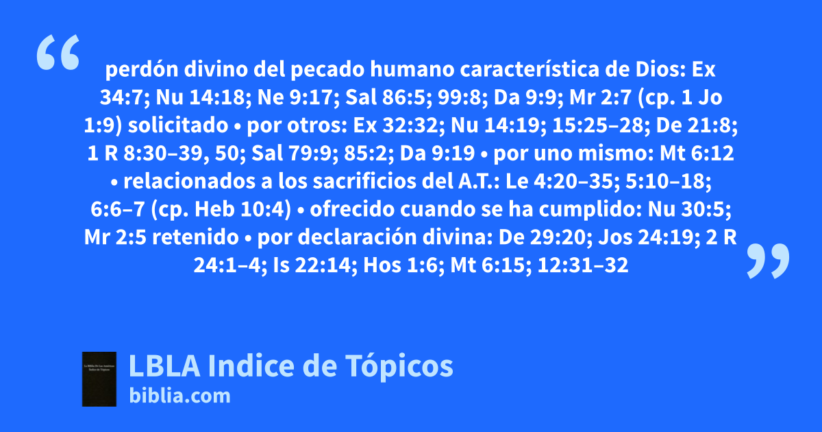 condiciones • confesión: Ne 1:6; Sal 32:5; 1 Jo 1:9 (cp. Pr 28:13) • perdonar a otros: Mt 6:14–15; 18:35 • arrepentimiento: Mr 1:4; Lc 24:47; Hch 2:38; 3:19; 8:22 (cp. Je 36:3; Mr 4:12) • fe en Cristo: Lc 7:44–50; Hch 10:43; 13:38–39; 26:8 (cp. Stg 5:15): la experiencia del: Sal 25:18; 32:5; Is 6:7; Col 2:13: resultados: Sal 32:1; 51:1, 7, 9; 103:12; 130:4; Is 38:17; 43:25; 44:22; Je 31:34 (cp. Heb 10:17); Heb 10:18: prometido (especialmente en el Nuevo Pacto): Is 27:9; 33:24; Je 31:34; Eze 16:63; Mt 12:31–32; Jn 20:23; Col 2:13