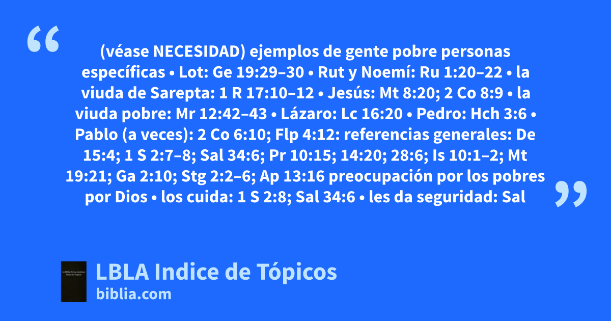 personas específicas • Lot: Ge 19:29–30 • Rut y Noemí: Ru 1:20–22 • la viuda de Sarepta: 1 R 17:10–12 • Jesús: Mt 8:20; 2 Co 8:9 • la viuda pobre: Mr 12:42–43 • Lázaro: Lc 16:20 • Pedro: Hch 3:6 • Pablo (a veces): 2 Co 6:10; Flp 4:12: referencias generales: De 15:4; 1 S 2:7–8; Sal 34:6; Pr 10:15; 14:20; 28:6; Is 10:1–2; Mt 19:21; Ga 2:10; Stg 2:2–6; Ap 13:16