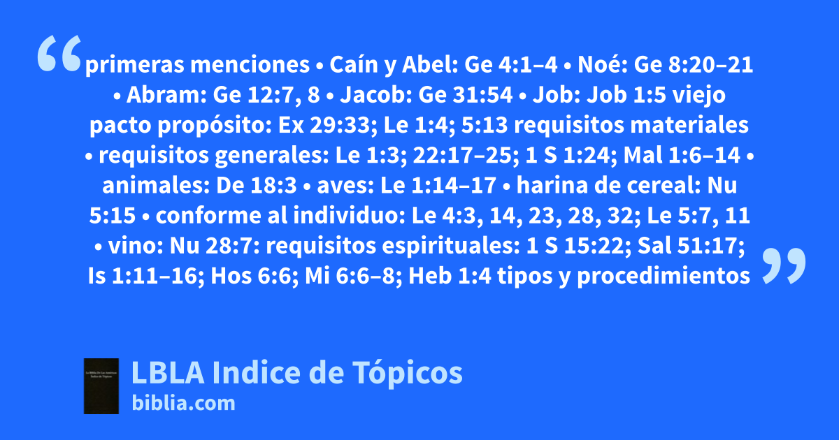 requisitos materiales • requisitos generales: Le 1:3; 22:17–25; 1 S 1:24; Mal 1:6–14 • animales: De 18:3 • aves: Le 1:14–17 • harina de cereal: Nu 5:15 • conforme al individuo: Le 4:3, 14, 23, 28, 32; Le 5:7, 11 • vino: Nu 28:7: requisitos espirituales: 1 S 15:22; Sal 51:17; Is 1:11–16; Hos 6:6; Mi 6:6–8; Heb 1:4