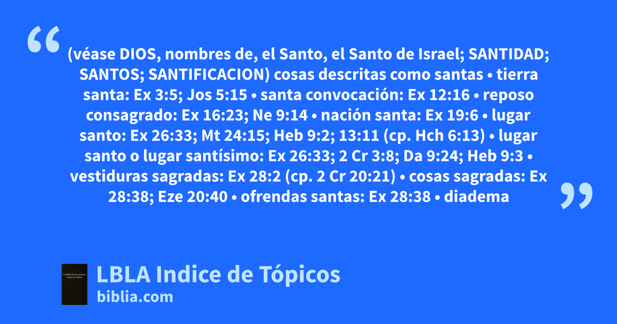 cosas descritas como santas • tierra santa: Ex 3:5; Jos 5:15 • santa convocación: Ex 12:16 • reposo consagrado: Ex 16:23; Ne 9:14 • nación santa: Ex 19:6 • lugar santo: Ex 26:33; Mt 24:15; Heb 9:2; 13:11 (cp. Hch 6:13) • lugar santo o lugar santísimo: Ex 26:33; 2 Cr 3:8; Da 9:24; Heb 9:3 • vestiduras sagradas: Ex 28:2 (cp. 2 Cr 20:21) • cosas sagradas: Ex 28:38; Eze 20:40 • ofrendas santas: Ex 28:38 • diadema santa: Ex 29:6 • comida sagrada: Ex 29:33–34 • altar santo: Ex 29:37 • aceite de santa unción: Ex 30:25; Sal 89:20 • incienso santo: Ex 30:35 • ofrenda santa: Le 2:3; 14:13 • santuario santo: Le 16:33 • fruto santo: Le 19:24 • santas convocaciones: Le 23:2 • agua santa: Nu 5:17 • incensarios santos: Nu 16:37 • primogénito santo: Nu 18:17; Lc 2:23 • vasos sagrados: Nu 31:6 • campamento santo: De 23:14 • los santos: De 33:2–3; Job 5:1; Sal 89:5, 7; Da 4:13, 17; Zec 14:5; Jud 14 • metales santos: Jos 6:19 • utensilios sagrados: 1 R 8:4 • majestad de santidad: 1 Cr 16:29 • santa casa: 1 Cr 29:3; Mi 1:2 • levitas consagrados: 2 Cr 35:3 • arca santa: 2 Cr 35:3 • día santo: Ne 8:9–10; Is 58:13 • ciudad santa (i.e., Jerusalén terrenal aquí): Ne 11:1, 18; Is 52:1; Da 9:24; Mt 4:5; Ap 11:2 • santo monte: Sal 2:6; Joe 2:1 • santo monte: Sal 15:1 • santo cielo: Sal 20:6 • santo trono: Sal 47:8 • tierra santa: Sal 78:54; Zec 2:12 • votos santos (hechos ligeramente): Pr 20:25 • simiente santa: Is 6:13 • casa santa: Is 64:11 • cámaras santas: Eze 42:13 • territorio santo alrededor del templo de Ezequiel: Eze 43:12 • porción sagrada de la tierra: Eze 45:1 • dioses santos: Da 4:8–9 • pacto santo: Da 11:28–30; Lc 1:72 • guerra santa: Mi 3:5 • santo templo del Señor: Hab 2:20 • carne consagrada: Hag 2:12 • santos ángeles: Mr 8:38; Ap 14:10 • santas Escrituras: Ro 1:2 • santa ley: Ro 7:12 • masa santa: Ro 11:16 • raíz santa: Ro 11:16 • sacrificio santo: Ro 12:1 • beso santo: Ro 16:16 • santo templo de Dios (i.e., iglesia local aquí): 1 Co 3:17 • santo en cuerpo y espíritu: 1 Co 7:34 • templo santo en el Señor (i.e., iglesia universal aquí): Ef 2:21 • manos santas: 1 Ti 2:8 • llamamiento santo: 2 Ti 1:9 • sacerdocio santo: 1 Pe 2:5 • nación santa: 1 Pe 2:9 • santo mandamiento: 2 Pe 2:21 • santa conducta: 2 Pe 3:11 • santísima fe: Jud 20 • ciudad santa (i.e., Jerusalén nueva o celestial aquí): Ap 21:2, 10