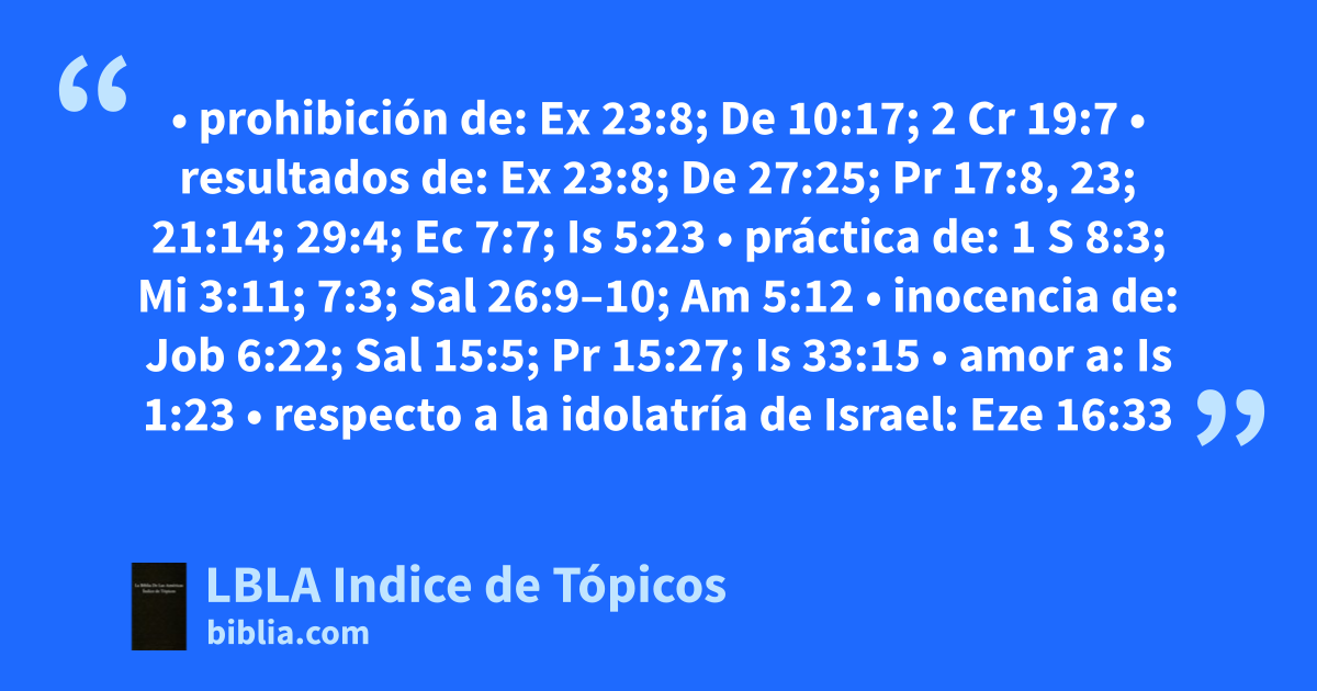 SOBORNO • prohibición de: Ex 23:8; De 10:17; 2 Cr 19:7 • resultados de: Ex 23:8; De 27:25; Pr 17:8, 23; 21:14; 29:4; Ec 7:7; Is 5:23 • práctica de: 1 S 8:3; Mi 3:11; 7:3; Sal 26:9–10; Am 5:12 • inocencia de: Job 6:22; Sal 15:5; Pr 15:27; Is 33:15 • amor a: Is 1:23 • respecto a la idolatría de Israel: Eze 16:33