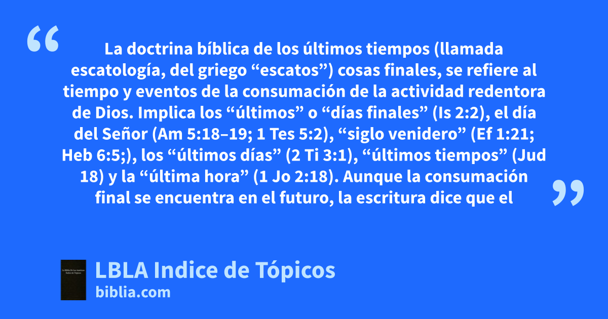 La doctrina bíblica de los últimos tiempos (llamada escatología, del griego “escatos”) cosas finales, se refiere al tiempo y eventos de la consumación de la actividad redentora de Dios. Implica los “últimos” o “días finales” (Is 2:2), el día del Señor (Am 5:18–19; 1 Tes 5:2), “siglo venidero” (Ef 1:21; Heb 6:5;), los “últimos días” (2 Ti 3:1), “últimos tiempos” (Jud 18) y la “última hora” (1 Jo 2:18). Aunque la consumación final se encuentra en el futuro, la escritura dice que el tiempo final comienza con la primera venida de Cristo (cp. Heb 1:2) y se extiende a la actividad final redentora de la creación de una nueva tierra y nuevos cielos. El tiempo presente pertenece, por tanto, a los tiempos finales (cp. 1 Jo 2:18). Ya sea que el Señor venga o que el creyente vaya al Señor, el tiempo final se realiza y cumple. Además de los eventos redentores de Cristo en su primera venida, las actividades divinas de los tiempos finales incluyen la regeneración espiritual que conlleva el Espíritu en el Nuevo Pacto (cp. Je 31:31–34; 2 Co 3:6) y la intervención objetiva de Dios en su acción histórica. Prominentes entre los eventos finales se encuentra el arrebatamiento de la iglesia (1 Tes 4:17), el tiempo de la tribulación o juicio de Dios (cp. Mt 24:21; Ap 6:16–17), el regreso de Cristo, i.e., el establecimiento de un reino mesiánico sobre sus enemigos (cp. Is 11:1–5; 1 Co 15:24–25) y la restauración final de todas las cosas por medio del juicio sobre toda carne, condenación de los malvados, glorificación de los justos y la creación de una nueva tierra y nuevos cielos (Ap 20:11–21:5). Existen variadas interpretaciones de estos eventos, especialmente en lo concerniente a la relación entre el arrebatamiento de la iglesia y el período final de la tribulación, así como sobre el tiempo y naturaleza del reino milenario. Los pretribulacionistas miran el arrebatamiento de la iglesia antes del período escatológico de la tribulación, el cual se considera ser el período de siete años en las setenta semanas de Daniel (cp. Da 9:27). Según los que creen que esto sucede a la mitad de la tribulación (algunos consideran esto como parte de los pretribulacionistas), la iglesia es arrebatada inmediatamente antes de la “gran tribulación” que comienza en medio de la semana setenta (cp. Mt 24:21). Los posmileniaristas consideran que el arrebatamiento tendrá lugar en conexión con la segunda venida de Cristo al final del período de la tribulación. Ya que la Escritura no menciona explícitamente el lugar y tiempo del arrebatamiento en relación con el período de tribulación, las diferentes posiciones se derivan del estudio de las escrituras relacionadas con, 1) la tribulación (Ap 3:10), 2) la cuestión de la inminencia de la segunda venida de Cristo, y 3) los eventos relacionados con el futuro regreso de Cristo (Mt 24). El milenio (del latín mille, “mil”), concepto derivado de Ap 20:1–10, denota el reino mesiánico temporal de Cristo antes del juicio final y la inauguración de los cielos nuevos y una nueva tierra. Para las distintas interpretaciones del milenio (véase REINO, DIA DEL SEÑOR).