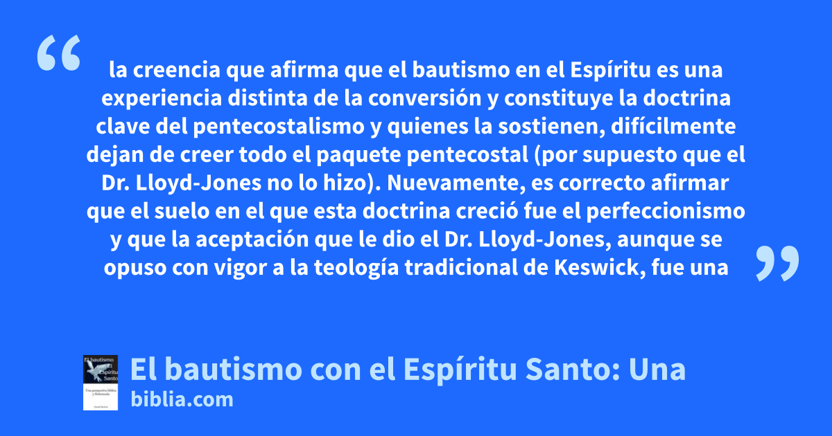 la creencia que afirma que el bautismo en el Espíritu es una experiencia distinta de la conversión y constituye la doctrina clave del pentecostalismo y quienes la sostienen, difícilmente dejan de creer todo el paquete pentecostal (por supuesto que el Dr. Lloyd-Jones no lo hizo). Nuevamente, es correcto afirmar que el suelo en el que esta doctrina creció fue el perfeccionismo y que la aceptación que le dio el Dr. Lloyd-Jones, aunque se opuso con vigor a la teología tradicional de Keswick, fue una