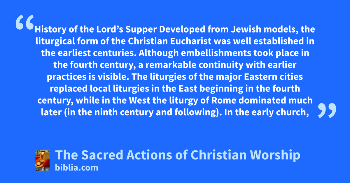 History of the Lord’s Supper Developed from Jewish models, the liturgical form of the Christian Eucharist was well established in the earliest centuries. Although embellishments took place in the fourth century, a remarkable continuity with earlier practices is visible. The liturgies of the major Eastern cities replaced local liturgies in the East beginning in the fourth century, while in the West the liturgy of Rome dominated much later (in the ninth century and following). In the early church,