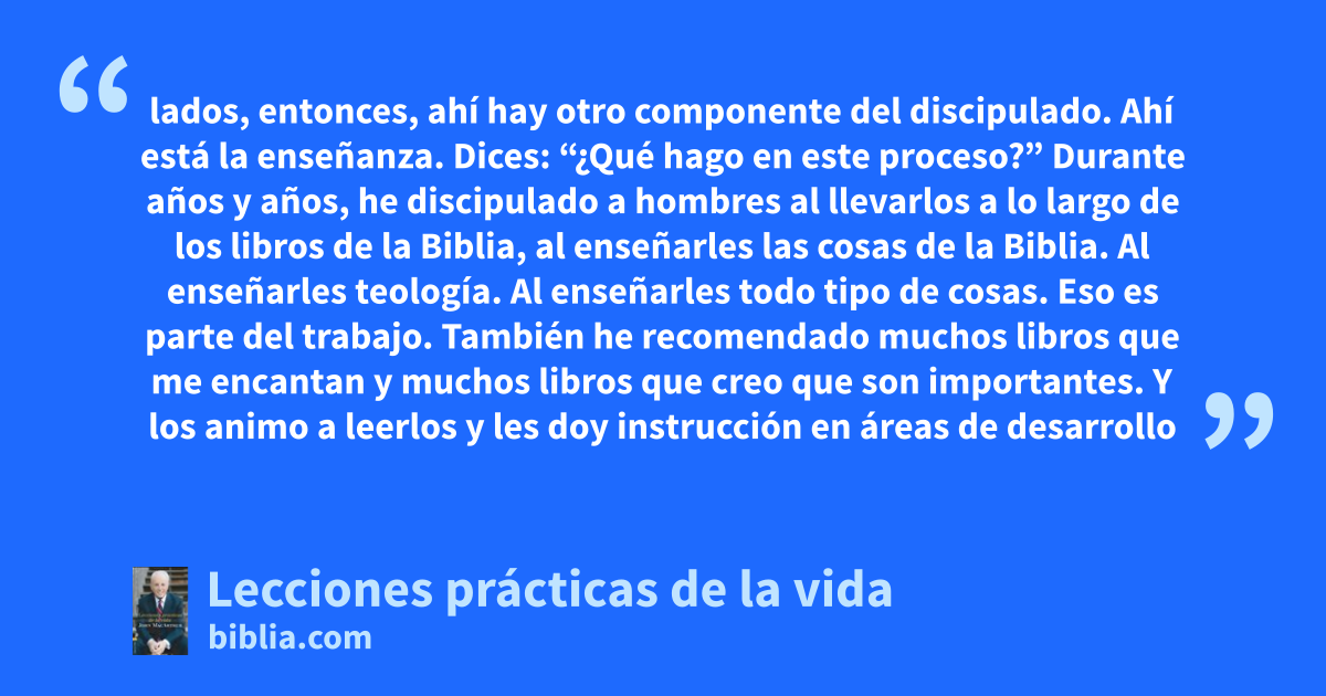 lados, entonces, ahí hay otro componente del discipulado. Ahí está la enseñanza. Dices: “¿Qué hago en este proceso?” Durante años y años, he discipulado a hombres al llevarlos a lo largo de los libros de la Biblia, al enseñarles las cosas de la Biblia. Al enseñarles teología. Al enseñarles todo tipo de cosas. Eso es parte del trabajo. También he recomendado muchos libros que me encantan y muchos libros que creo que son importantes. Y los animo a leerlos y les doy instrucción en áreas de desarrollo