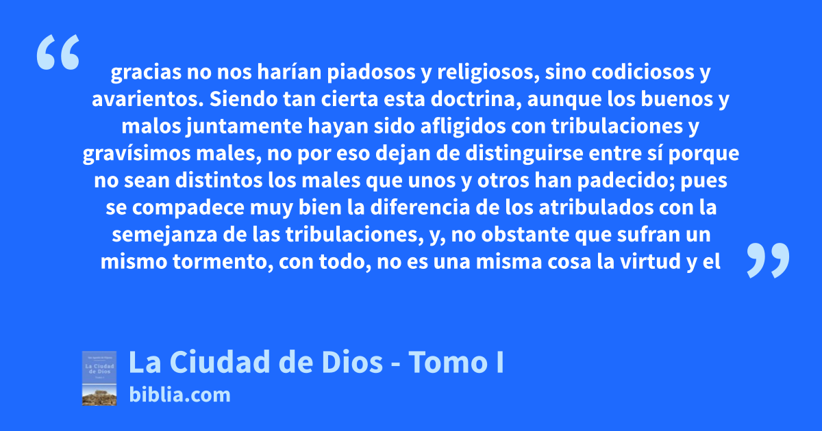 gracias no nos harían piadosos y religiosos, sino codiciosos y avarientos. Siendo tan cierta esta doctrina, aunque los buenos y malos juntamente hayan sido afligidos con tribulaciones y gravísimos males, no por eso dejan de distinguirse entre sí porque no sean distintos los males que unos y otros han padecido; pues se compadece muy bien la diferencia de los atribulados con la semejanza de las tribulaciones, y, no obstante que sufran un mismo tormento, con todo, no es una misma cosa la virtud y el