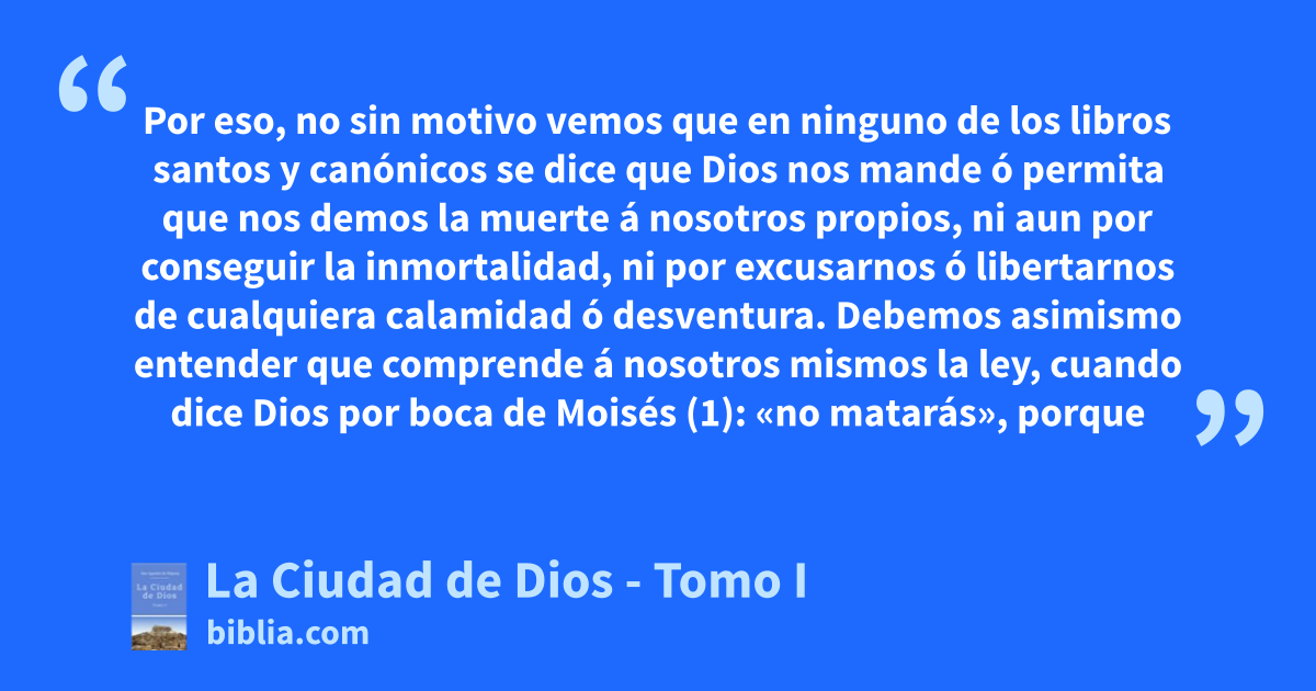 Por eso, no sin motivo vemos que en ninguno de los libros santos y canónicos se dice que Dios nos mande ó permita que nos demos la muerte á nosotros propios, ni aun por conseguir la inmortalidad, ni por excusarnos ó libertarnos de cualquiera calamidad ó desventura. Debemos asimismo entender que comprende á nosotros mismos la ley, cuando dice Dios por boca de Moisés (1): «no matarás», porque