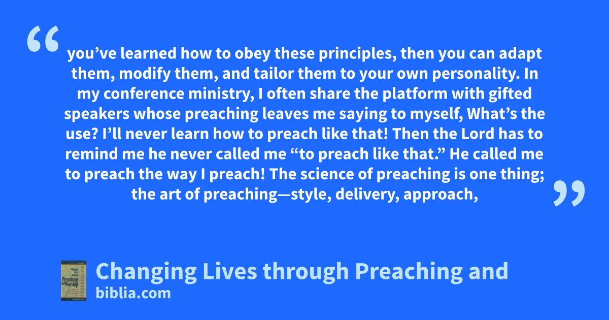 you’ve learned how to obey these principles, then you can adapt them, modify them, and tailor them to your own personality. In my conference ministry, I often share the platform with gifted speakers whose preaching leaves me saying to myself, What’s the use? I’ll never learn how to preach like that! Then the Lord has to remind me he never called me “to preach like that.” He called me to preach the way I preach! The science of preaching is one thing; the art of preaching—style, delivery, approach,