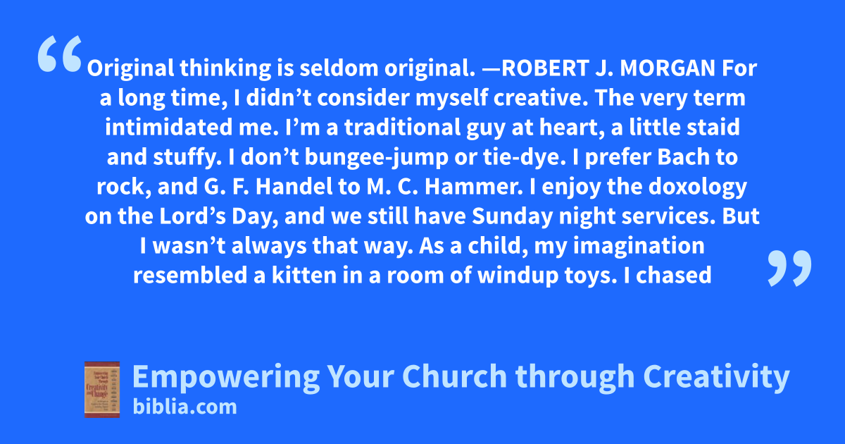 Original thinking is seldom original. —ROBERT J. MORGAN For a long time, I didn’t consider myself creative. The very term intimidated me. I’m a traditional guy at heart, a little staid and stuffy. I don’t bungee-jump or tie-dye. I prefer Bach to rock, and G. F. Handel to M. C. Hammer. I enjoy the doxology on the Lord’s Day, and we still have Sunday night services. But I wasn’t always that way. As a child, my imagination resembled a kitten in a room of windup toys. I chased