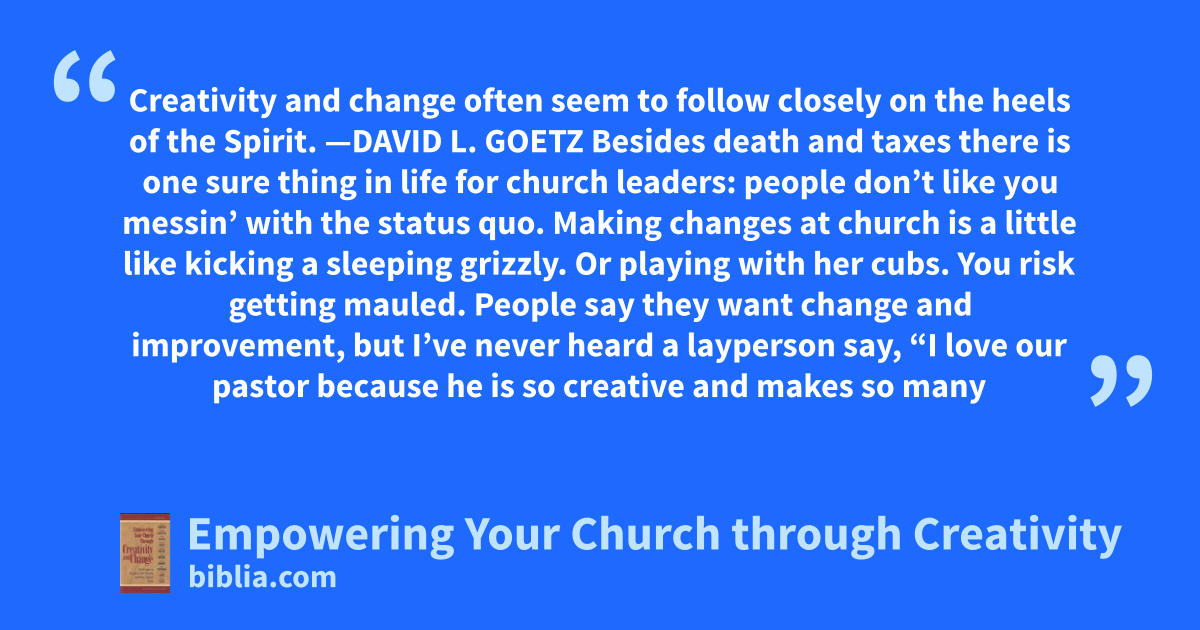 Creativity and change often seem to follow closely on the heels of the Spirit. —DAVID L. GOETZ Besides death and taxes there is one sure thing in life for church leaders: people don’t like you messin’ with the status quo. Making changes at church is a little like kicking a sleeping grizzly. Or playing with her cubs. You risk getting mauled. People say they want change and improvement, but I’ve never heard a layperson say, “I love our pastor because he is so creative and makes so many
