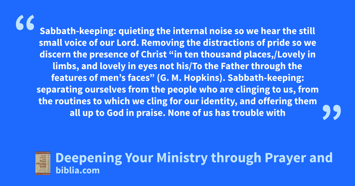 Sabbath-keeping: quieting the internal noise so we hear the still small voice of our Lord. Removing the distractions of pride so we discern the presence of Christ “in ten thousand places,/Lovely in limbs, and lovely in eyes not his/To the Father through the features of men’s faces” (G. M. Hopkins). Sabbath-keeping: separating ourselves from the people who are clinging to us, from the routines to which we cling for our identity, and offering them all up to God in praise. None of us has trouble with