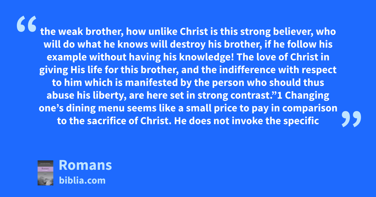 the weak brother, how unlike Christ is this strong believer, who will do what he knows will destroy his brother, if he follow his example without having his knowledge! The love of Christ in giving His life for this brother, and the indifference with respect to him which is manifested by the person who should thus abuse his liberty, are here set in strong contrast.”1 Changing one’s dining menu seems like a small price to pay in comparison to the sacrifice of Christ. He does not invoke the specific