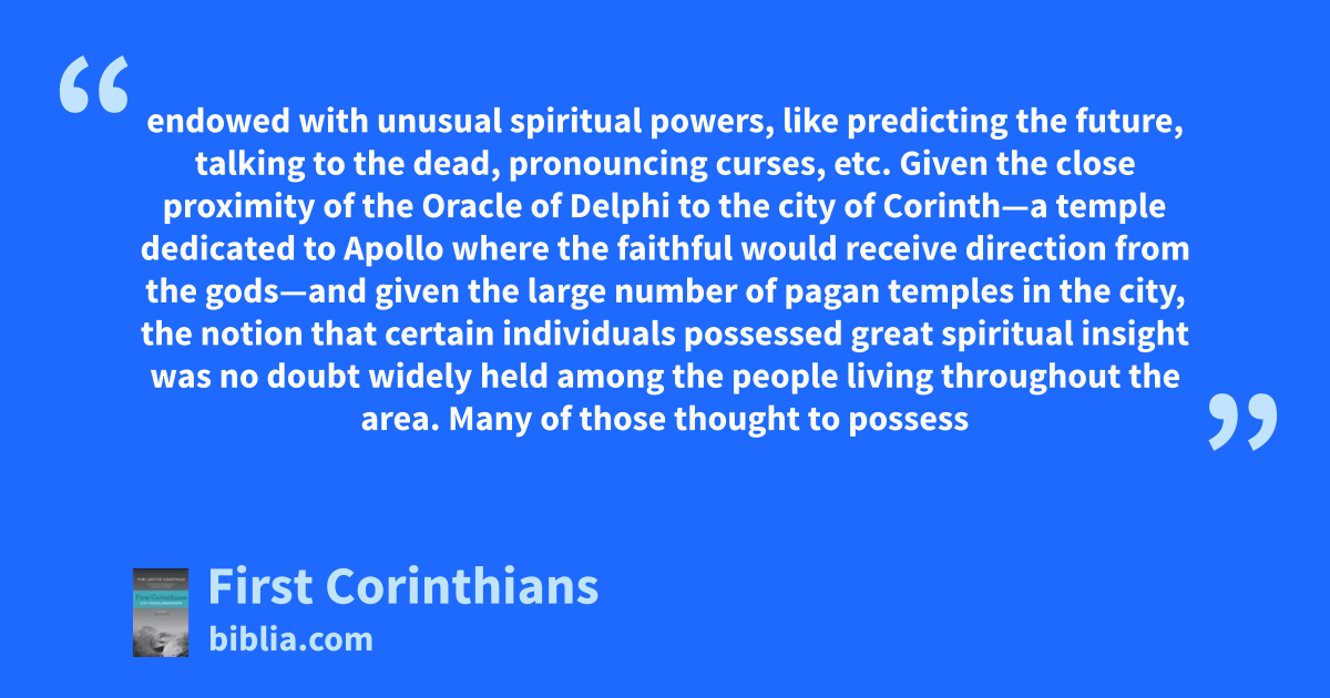 endowed with unusual spiritual powers, like predicting the future, talking to the dead, pronouncing curses, etc. Given the close proximity of the Oracle of Delphi to the city of Corinth—a temple dedicated to Apollo where the faithful would receive direction from the gods—and given the large number of pagan temples in the city, the notion that certain individuals possessed great spiritual insight was no doubt widely held among the people living throughout the area. Many of those thought to possess
