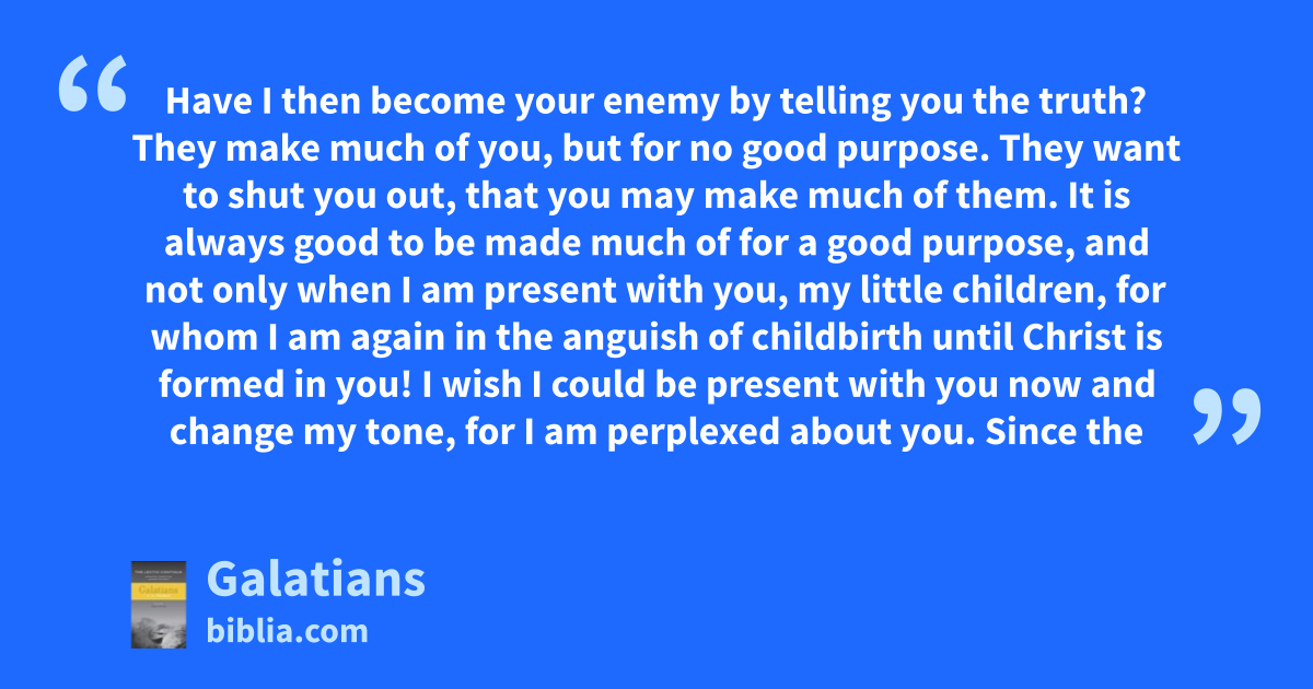 Have I then become your enemy by telling you the truth? They make much of you, but for no good purpose. They want to shut you out, that you may make much of them. It is always good to be made much of for a good purpose, and not only when I am present with you, my little children, for whom I am again in the anguish of childbirth until Christ is formed in you! I wish I could be present with you now and change my tone, for I am perplexed about you. Since the