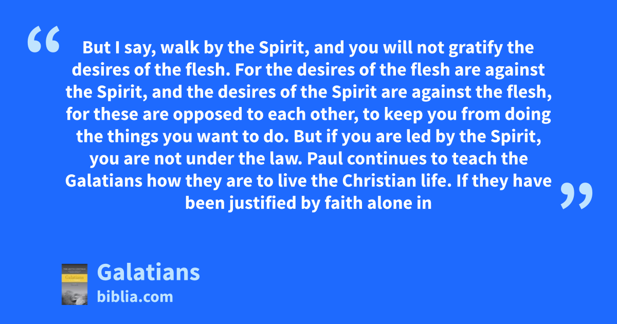 But I say, walk by the Spirit, and you will not gratify the desires of the flesh. For the desires of the flesh are against the Spirit, and the desires of the Spirit are against the flesh, for these are opposed to each other, to keep you from doing the things you want to do. But if you are led by the Spirit, you are not under the law. Paul continues to teach the Galatians how they are to live the Christian life. If they have been justified by faith alone in