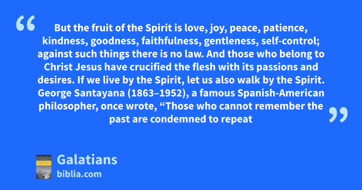 But the fruit of the Spirit is love, joy, peace, patience, kindness, goodness, faithfulness, gentleness, self-control; against such things there is no law. And those who belong to Christ Jesus have crucified the flesh with its passions and desires. If we live by the Spirit, let us also walk by the Spirit. George Santayana (1863–1952), a famous Spanish-American philosopher, once wrote, “Those who cannot remember the past are condemned to repeat