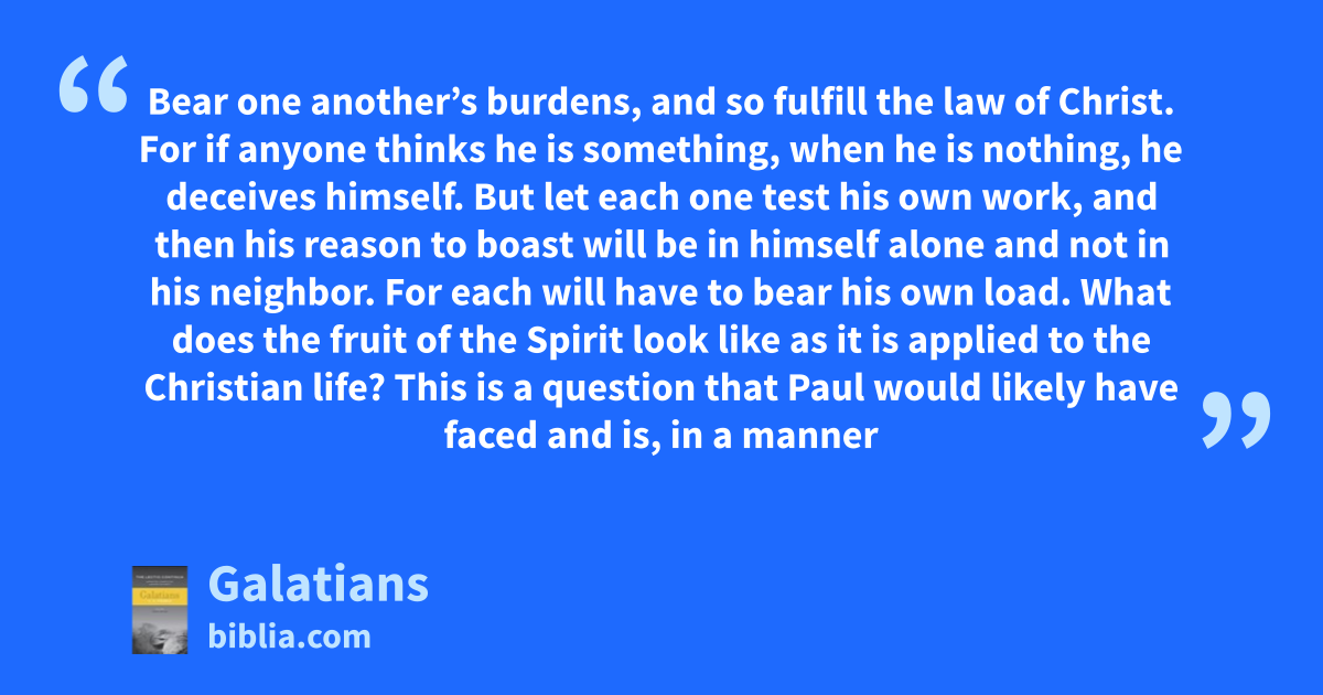 Bear one another’s burdens, and so fulfill the law of Christ. For if anyone thinks he is something, when he is nothing, he deceives himself. But let each one test his own work, and then his reason to boast will be in himself alone and not in his neighbor. For each will have to bear his own load. What does the fruit of the Spirit look like as it is applied to the Christian life? This is a question that Paul would likely have faced and is, in a manner