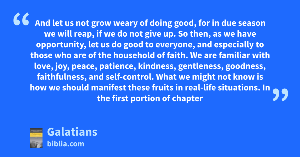 And let us not grow weary of doing good, for in due season we will reap, if we do not give up. So then, as we have opportunity, let us do good to everyone, and especially to those who are of the household of faith. We are familiar with love, joy, peace, patience, kindness, gentleness, goodness, faithfulness, and self-control. What we might not know is how we should manifest these fruits in real-life situations. In the first portion of chapter