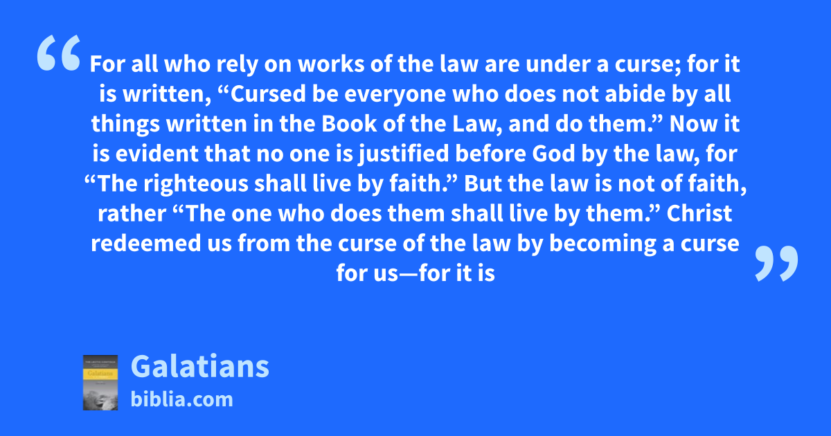 For all who rely on works of the law are under a curse; for it is written, “Cursed be everyone who does not abide by all things written in the Book of the Law, and do them.” Now it is evident that no one is justified before God by the law, for “The righteous shall live by faith.” But the law is not of faith, rather “The one who does them shall live by them.” Christ redeemed us from the curse of the law by becoming a curse for us—for it is