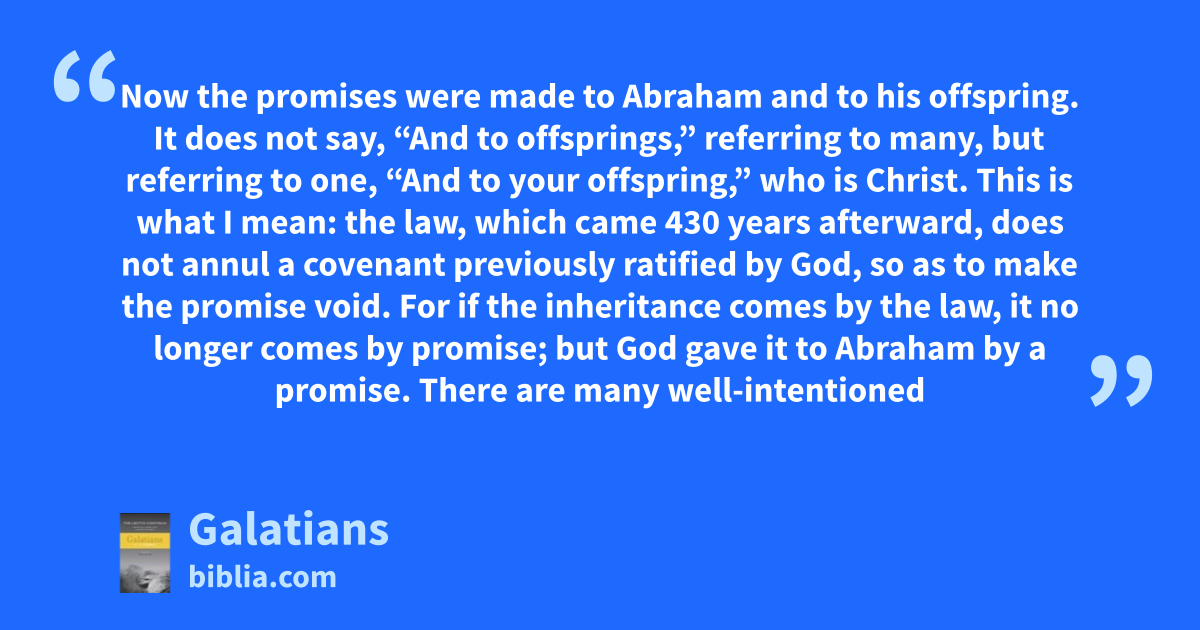 Now the promises were made to Abraham and to his offspring. It does not say, “And to offsprings,” referring to many, but referring to one, “And to your offspring,” who is Christ. This is what I mean: the law, which came 430 years afterward, does not annul a covenant previously ratified by God, so as to make the promise void. For if the inheritance comes by the law, it no longer comes by promise; but God gave it to Abraham by a promise. There are many well-intentioned