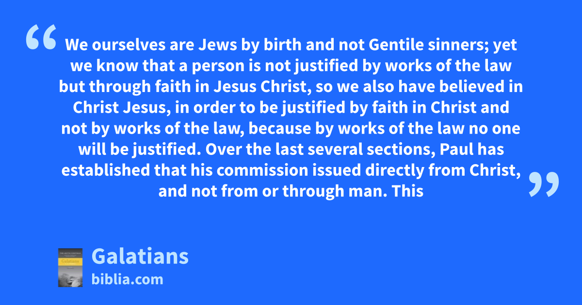We ourselves are Jews by birth and not Gentile sinners; yet we know that a person is not justified by works of the law but through faith in Jesus Christ, so we also have believed in Christ Jesus, in order to be justified by faith in Christ and not by works of the law, because by works of the law no one will be justified. Over the last several sections, Paul has established that his commission issued directly from Christ, and not from or through man. This