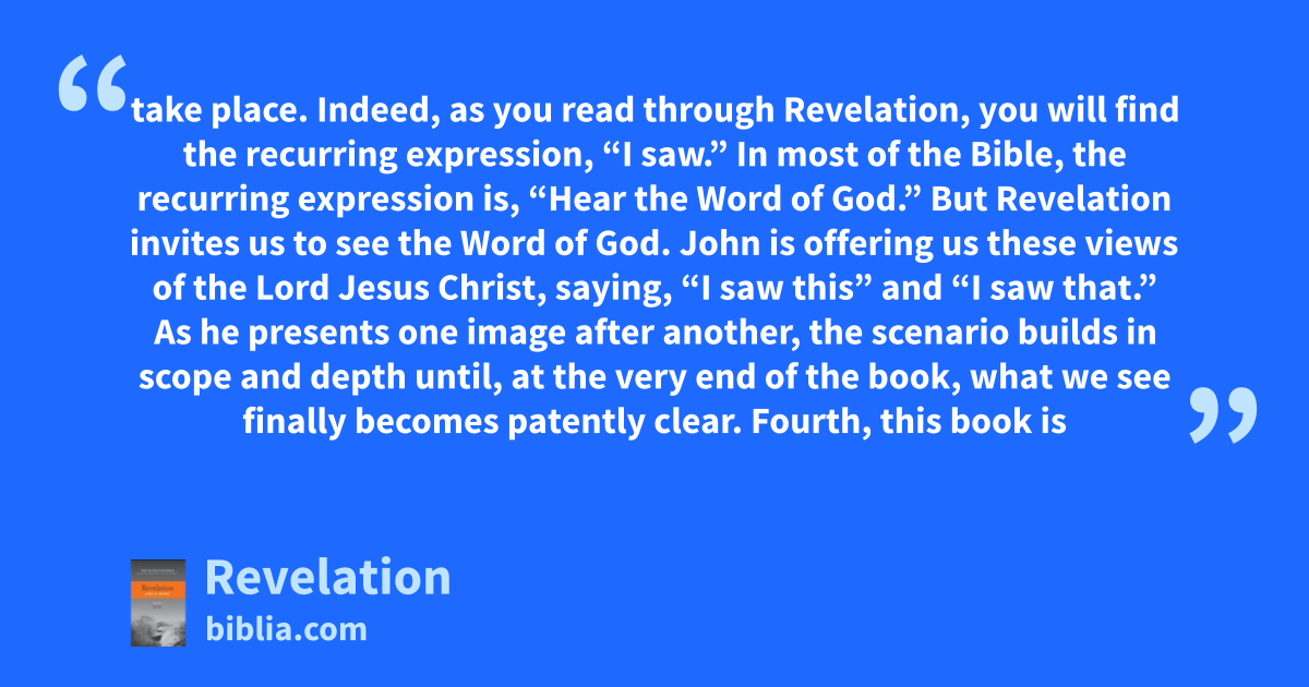 take place. Indeed, as you read through Revelation, you will find the recurring expression, “I saw.” In most of the Bible, the recurring expression is, “Hear the Word of God.” But Revelation invites us to see the Word of God. John is offering us these views of the Lord Jesus Christ, saying, “I saw this” and “I saw that.” As he presents one image after another, the scenario builds in scope and depth until, at the very end of the book, what we see finally becomes patently clear. Fourth, this book is