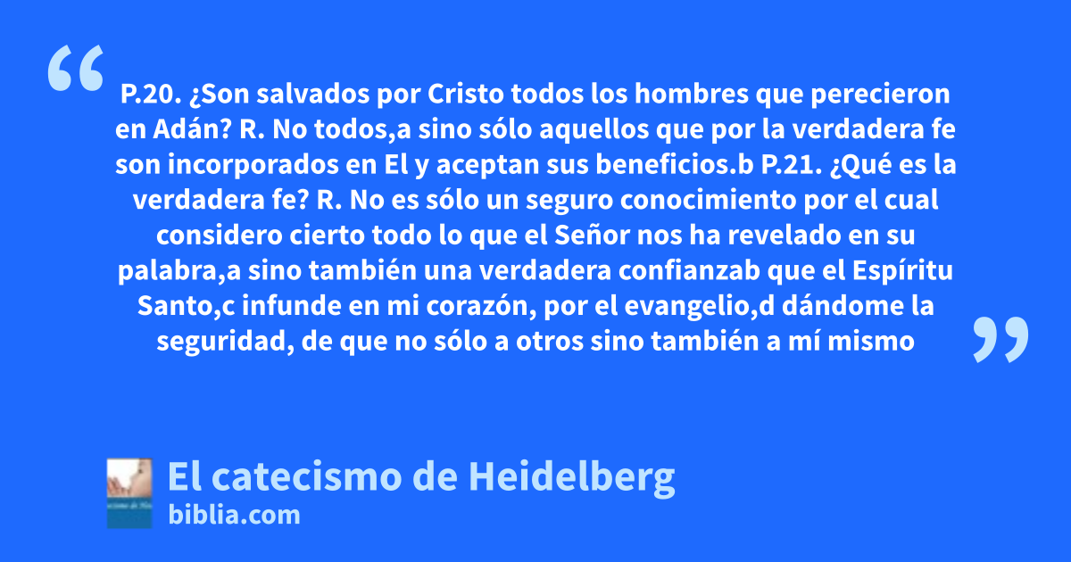 P.20. ¿Son salvados por Cristo todos los hombres que perecieron en Adán? R. No todos,a sino sólo aquellos que por la verdadera fe son incorporados en El y aceptan sus beneficios.b P.21. ¿Qué es la verdadera fe? R. No es sólo un seguro conocimiento por el cual considero cierto todo lo que el Señor nos ha revelado en su palabra,a sino también una verdadera confianzab que el Espíritu Santo,c infunde en mi corazón, por el evangelio,d dándome la seguridad, de que no sólo a otros sino también a mí mismo