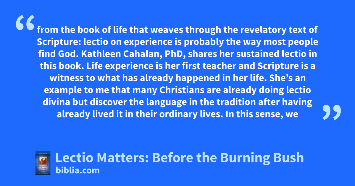 from the book of life that weaves through the revelatory text of Scripture: lectio on experience is probably the way most people find God. Kathleen Cahalan, PhD, shares her sustained lectio in this book. Life experience is her first teacher and Scripture is a witness to what has already happened in her life. She’s an example to me that many Christians are already doing lectio divina but discover the language in the tradition after having already lived it in their ordinary lives. In this sense, we