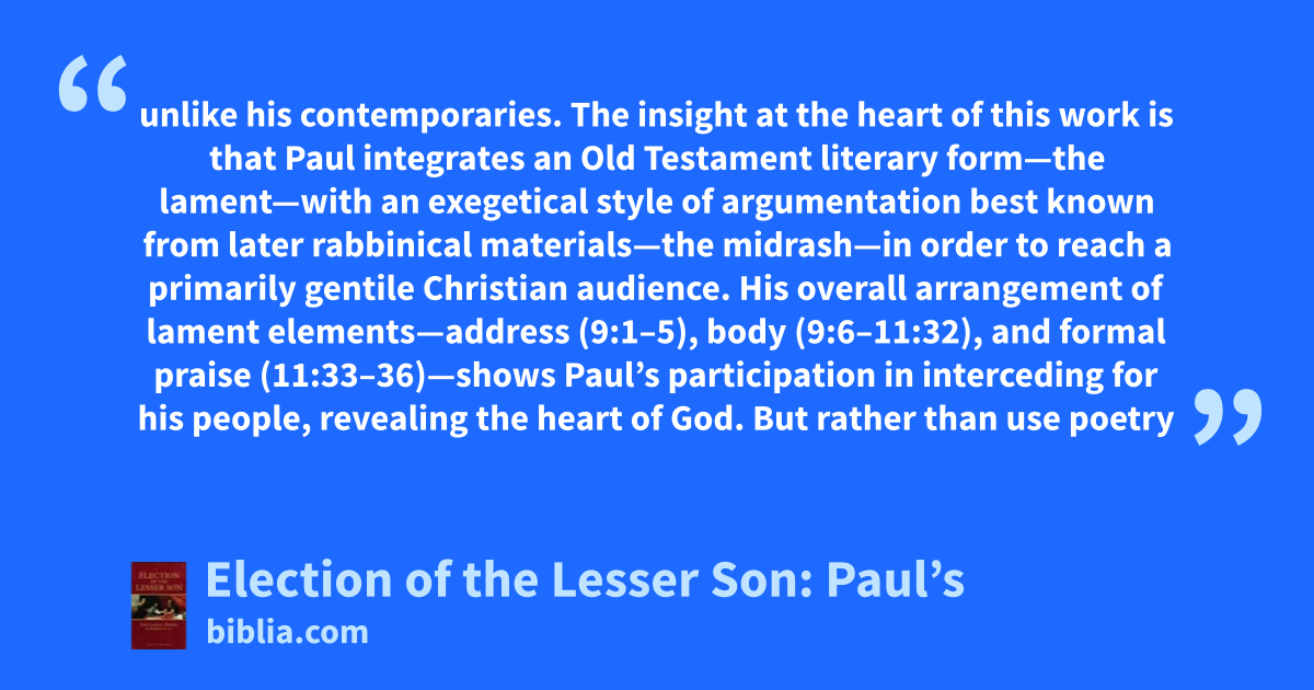 unlike his contemporaries. The insight at the heart of this work is that Paul integrates an Old Testament literary form—the lament—with an exegetical style of argumentation best known from later rabbinical materials—the midrash—in order to reach a primarily gentile Christian audience. His overall arrangement of lament elements—address (9:1–5), body (9:6–11:32), and formal praise (11:33–36)—shows Paul’s participation in interceding for his people, revealing the heart of God. But rather than use poetry