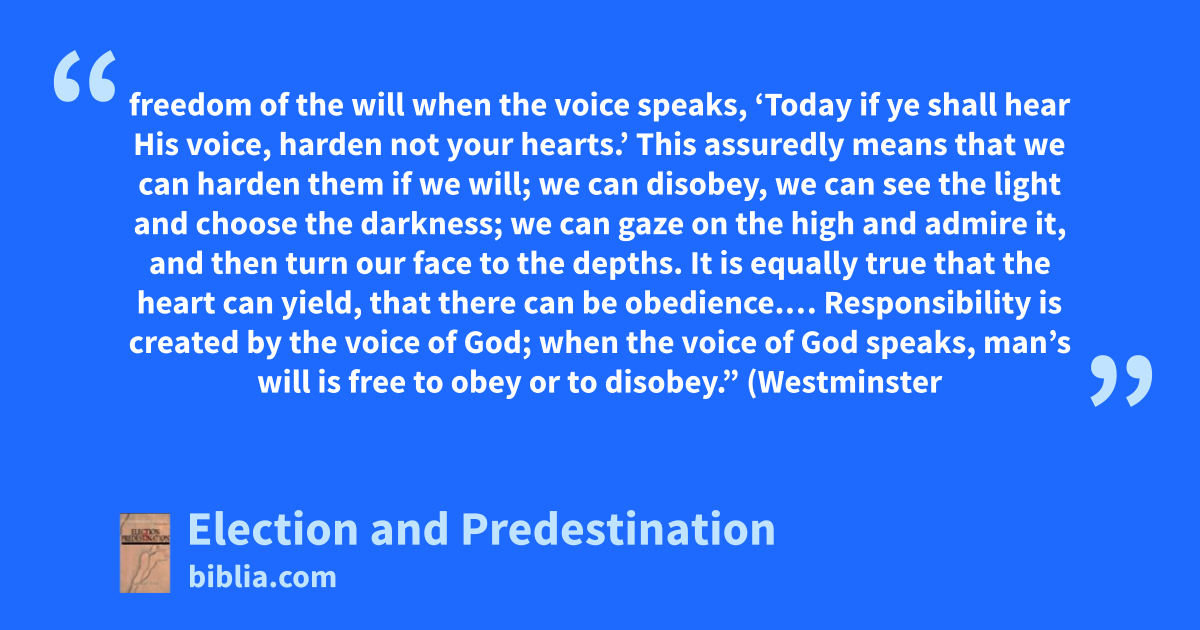 freedom of the will when the voice speaks, ‘Today if ye shall hear His voice, harden not your hearts.’ This assuredly means that we can harden them if we will; we can disobey, we can see the light and choose the darkness; we can gaze on the high and admire it, and then turn our face to the depths. It is equally true that the heart can yield, that there can be obedience.… Responsibility is created by the voice of God; when the voice of God speaks, man’s will is free to obey or to disobey.” (Westminster