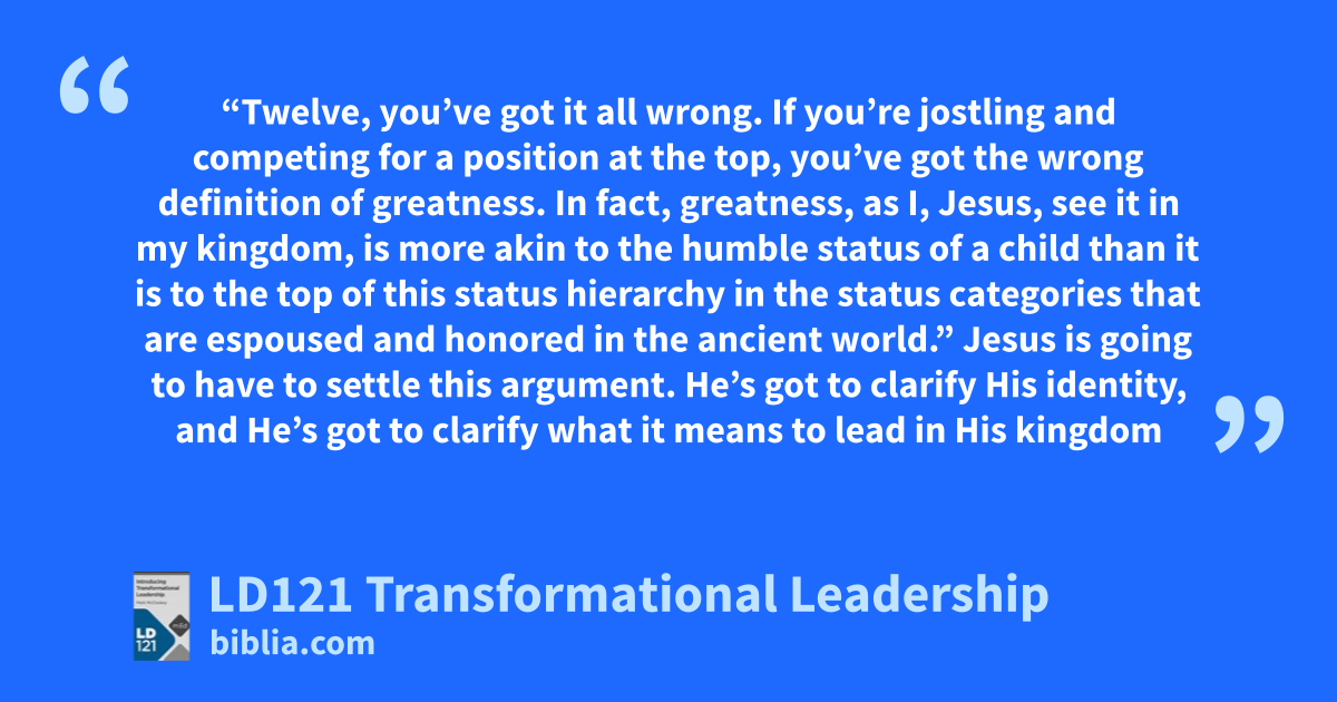 “Twelve, you’ve got it all wrong. If you’re jostling and competing for a position at the top, you’ve got the wrong definition of greatness. In fact, greatness, as I, Jesus, see it in my kingdom, is more akin to the humble status of a child than it is to the top of this status hierarchy in the status categories that are espoused and honored in the ancient world.” Jesus is going to have to settle this argument. He’s got to clarify His identity, and He’s got to clarify what it means to lead in His kingdom