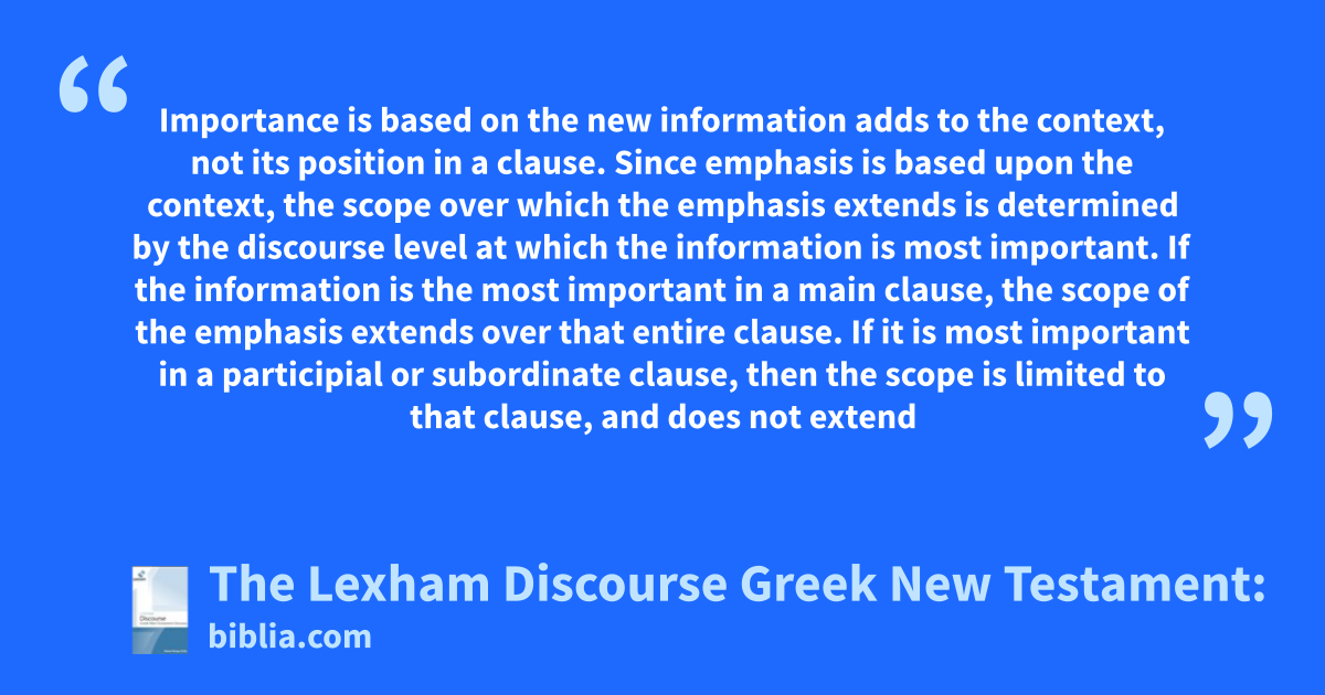 Importance is based on the new information adds to the context, not its position in a clause. Since emphasis is based upon the context, the scope over which the emphasis extends is determined by the discourse level at which the information is most important. If the information is the most important in a main clause, the scope of the emphasis extends over that entire clause. If it is most important in a participial or subordinate clause, then the scope is limited to that clause, and does not extend
