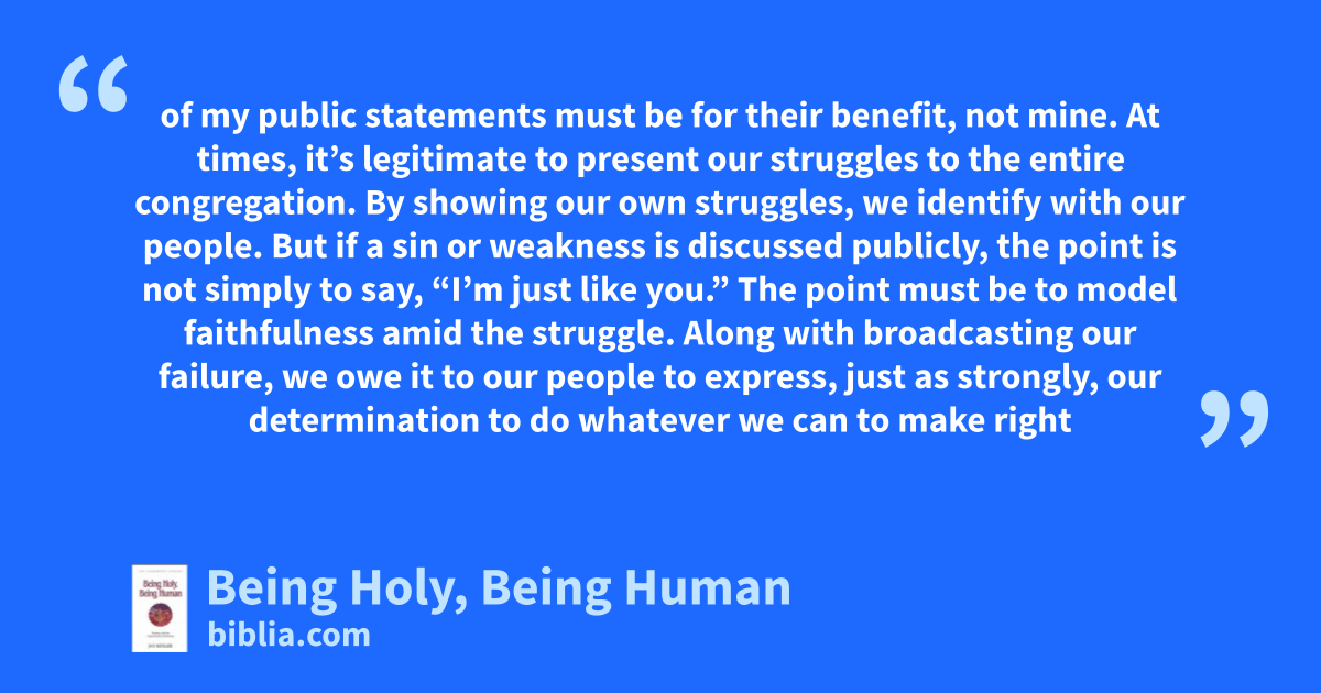 of my public statements must be for their benefit, not mine. At times, it’s legitimate to present our struggles to the entire congregation. By showing our own struggles, we identify with our people. But if a sin or weakness is discussed publicly, the point is not simply to say, “I’m just like you.” The point must be to model faithfulness amid the struggle. Along with broadcasting our failure, we owe it to our people to express, just as strongly, our determination to do whatever we can to make right