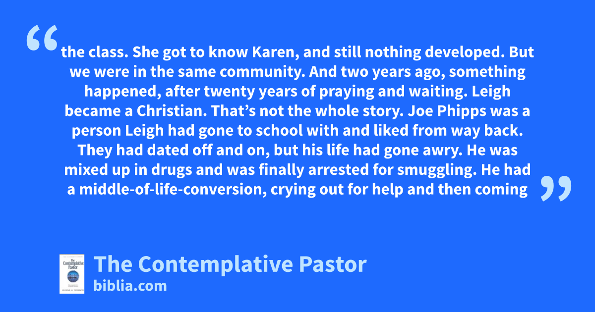 the class. She got to know Karen, and still nothing developed. But we were in the same community. And two years ago, something happened, after twenty years of praying and waiting. Leigh became a Christian. That’s not the whole story. Joe Phipps was a person Leigh had gone to school with and liked from way back. They had dated off and on, but his life had gone awry. He was mixed up in drugs and was finally arrested for smuggling. He had a middle-of-life-conversion, crying out for help and then coming