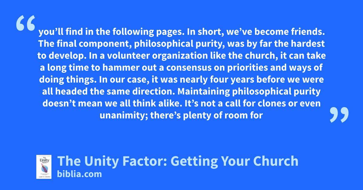 you’ll find in the following pages. In short, we’ve become friends. The final component, philosophical purity, was by far the hardest to develop. In a volunteer organization like the church, it can take a long time to hammer out a consensus on priorities and ways of doing things. In our case, it was nearly four years before we were all headed the same direction. Maintaining philosophical purity doesn’t mean we all think alike. It’s not a call for clones or even unanimity; there’s plenty of room for