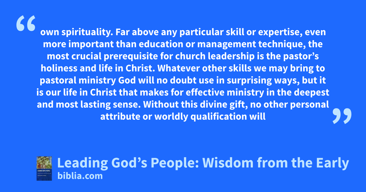 own spirituality. Far above any particular skill or expertise, even more important than education or management technique, the most crucial prerequisite for church leadership is the pastor’s holiness and life in Christ. Whatever other skills we may bring to pastoral ministry God will no doubt use in surprising ways, but it is our life in Christ that makes for effective ministry in the deepest and most lasting sense. Without this divine gift, no other personal attribute or worldly qualification will