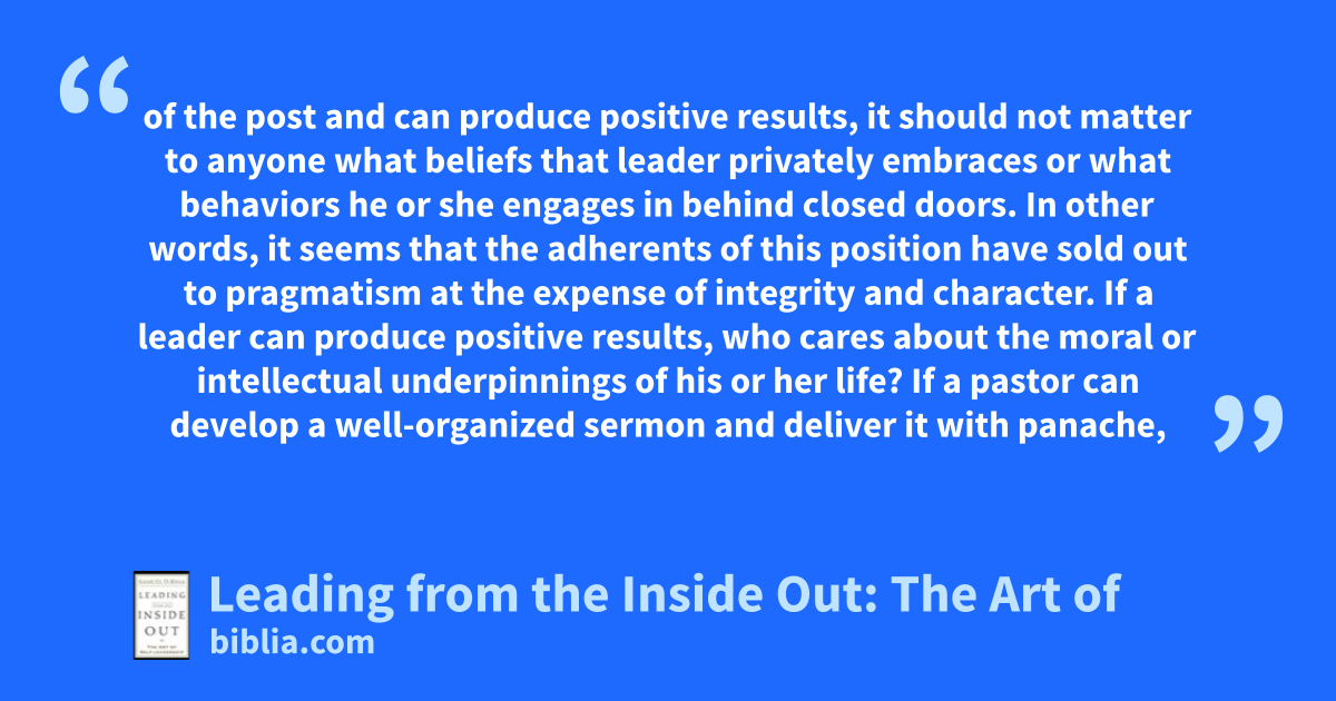 of the post and can produce positive results, it should not matter to anyone what beliefs that leader privately embraces or what behaviors he or she engages in behind closed doors. In other words, it seems that the adherents of this position have sold out to pragmatism at the expense of integrity and character. If a leader can produce positive results, who cares about the moral or intellectual underpinnings of his or her life? If a pastor can develop a well-organized sermon and deliver it with panache,