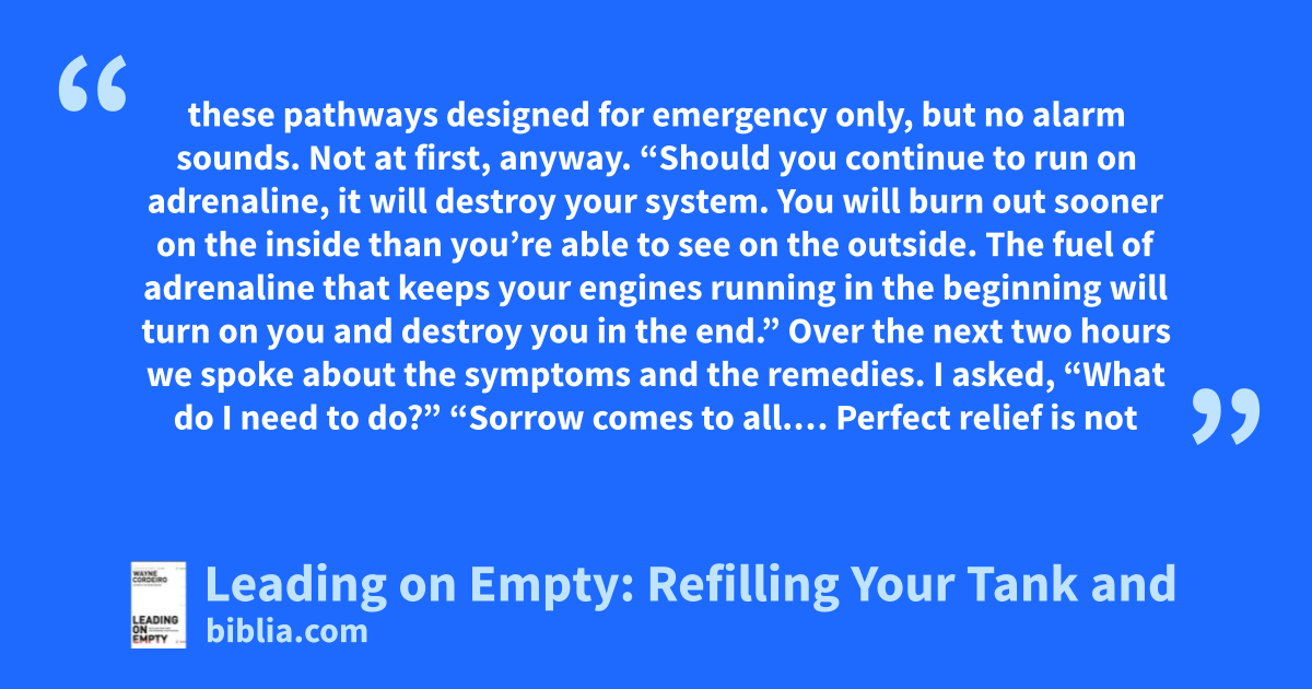 these pathways designed for emergency only, but no alarm sounds. Not at first, anyway. “Should you continue to run on adrenaline, it will destroy your system. You will burn out sooner on the inside than you’re able to see on the outside. The fuel of adrenaline that keeps your engines running in the beginning will turn on you and destroy you in the end.” Over the next two hours we spoke about the symptoms and the remedies. I asked, “What do I need to do?” “Sorrow comes to all.… Perfect relief is not