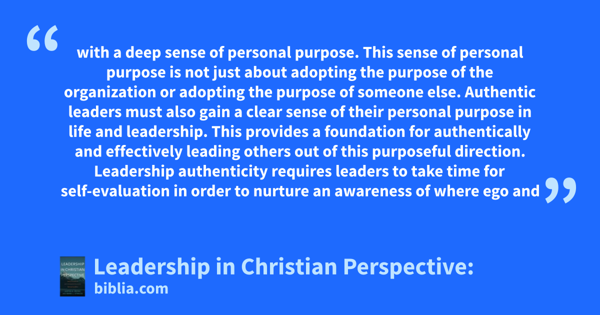 with a deep sense of personal purpose. This sense of personal purpose is not just about adopting the purpose of the organization or adopting the purpose of someone else. Authentic leaders must also gain a clear sense of their personal purpose in life and leadership. This provides a foundation for authentically and effectively leading others out of this purposeful direction. Leadership authenticity requires leaders to take time for self-evaluation in order to nurture an awareness of where ego and