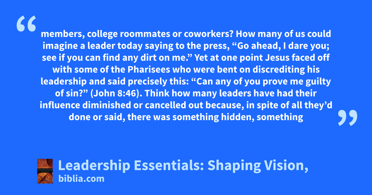 members, college roommates or coworkers? How many of us could imagine a leader today saying to the press, “Go ahead, I dare you; see if you can find any dirt on me.” Yet at one point Jesus faced off with some of the Pharisees who were bent on discrediting his leadership and said precisely this: “Can any of you prove me guilty of sin?” (John 8:46). Think how many leaders have had their influence diminished or cancelled out because, in spite of all they’d done or said, there was something hidden, something