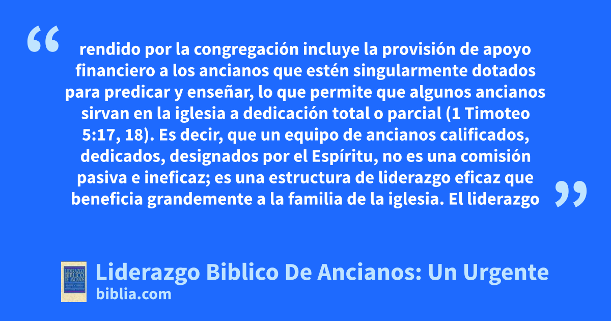 rendido por la congregación incluye la provisión de apoyo financiero a los ancianos que estén singularmente dotados para predicar y enseñar, lo que permite que algunos ancianos sirvan en la iglesia a dedicación total o parcial (1 Timoteo 5:17, 18). Es decir, que un equipo de ancianos calificados, dedicados, designados por el Espíritu, no es una comisión pasiva e ineficaz; es una estructura de liderazgo eficaz que beneficia grandemente a la familia de la iglesia. El liderazgo