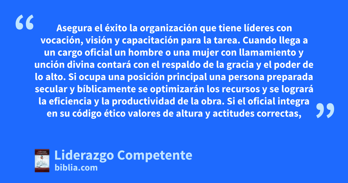 Asegura el éxito la organización que tiene líderes con vocación, visión y capacitación para la tarea. Cuando llega a un cargo oficial un hombre o una mujer con llamamiento y unción divina contará con el respaldo de la gracia y el poder de lo alto. Si ocupa una posición principal una persona preparada secular y bíblicamente se optimizarán los recursos y se logrará la eficiencia y la productividad de la obra. Si el oficial integra en su código ético valores de altura y actitudes correctas,