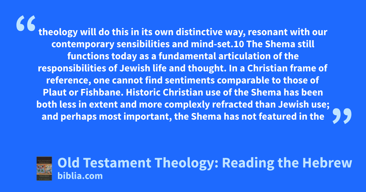 theology will do this in its own distinctive way, resonant with our contemporary sensibilities and mind-set.10 The Shema still functions today as a fundamental articulation of the responsibilities of Jewish life and thought. In a Christian frame of reference, one cannot find sentiments comparable to those of Plaut or Fishbane. Historic Christian use of the Shema has been both less in extent and more complexly refracted than Jewish use; and perhaps most important, the Shema has not featured in the