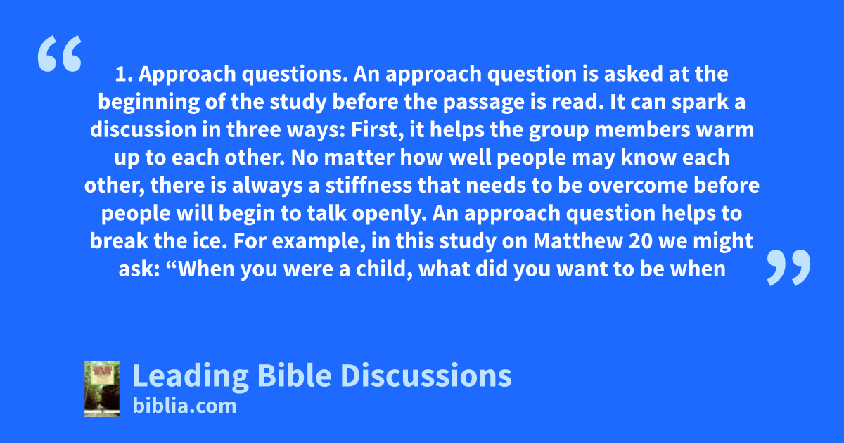 1. Approach questions. An approach question is asked at the beginning of the study before the passage is read. It can spark a discussion in three ways: First, it helps the group members warm up to each other. No matter how well people may know each other, there is always a stiffness that needs to be overcome before people will begin to talk openly. An approach question helps to break the ice. For example, in this study on Matthew 20 we might ask: “When you were a child, what did you want to be when