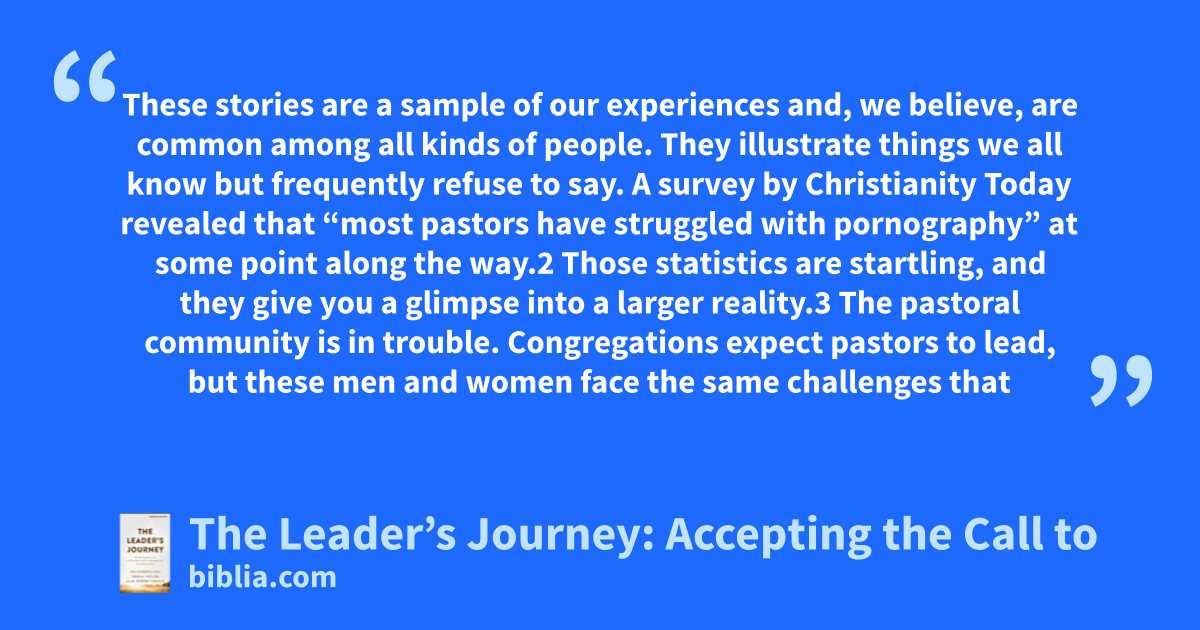 These stories are a sample of our experiences and, we believe, are common among all kinds of people. They illustrate things we all know but frequently refuse to say. A survey by Christianity Today revealed that “most pastors have struggled with pornography” at some point along the way.2 Those statistics are startling, and they give you a glimpse into a larger reality.3 The pastoral community is in trouble. Congregations expect pastors to lead, but these men and women face the same challenges that